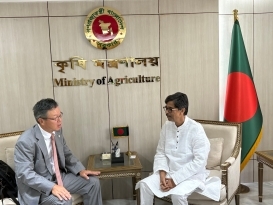| On April 6, Ambassador SAIDA Shinichi paid a courtesy call on Mr. Mohammad Amin Ur Rashid, Honorable Minister for Agriculture, Fisheries and Livestock. Ambassador SAIDA explained Japan’s ongoing cooperation in the field of agriculture, fisheries and livestock, and both sides engaged in discussions on a wide range of issues including recent efforts by the Japanese private sector as well as the ongoing ODA projects. Both sides expressed interest in promoting cooperation in the sector of agriculture, fisheries and livestock, and concurred to work together to further strengthening the bilateral relations. |