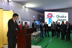 今回のレセプションでは、当地で活動する日本企業や関連団体がブースを設置し、それぞれの活動紹介を行いました。また、日本産のホタテが出席者の前で調理され、提供されました。さらに、齋田大使は、シェイク・ボシール・ウッディン商業顧問に対し大阪関西万博の公式キャラクターであるミャクミャク君の引き渡しを行いました。会場では、特設ブースが設置され、万博に向けたプロモーションを行われました。