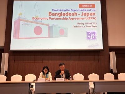 お知らせ 令和8年3月25日 齋田大使、CPD主催「日・バングラデシュ経済連携協定(EPA)の機会最大化」セミナーに出席 3月16日、齋田大使は、当館で開催された政策対話センター(CPD)主催の「日・バングラデシュ経済連携協定(EPA)の機会最大化」セミナーに出席しました。 英文リンク