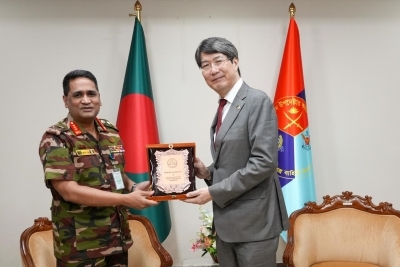 お知らせ 令和6年9月23日 岩間大使によるハッサン首席顧問府軍務局首席幕僚表敬 9月22日、岩間大使は、新しく就任した、S・M・カムルル・ハッサン首相府軍務局首席幕僚を表敬訪問しました。岩間大使はハッサン首席幕僚との間で、日本とバングラデシュの二国間関係における今後の防衛協力や人的交流について議論しました。